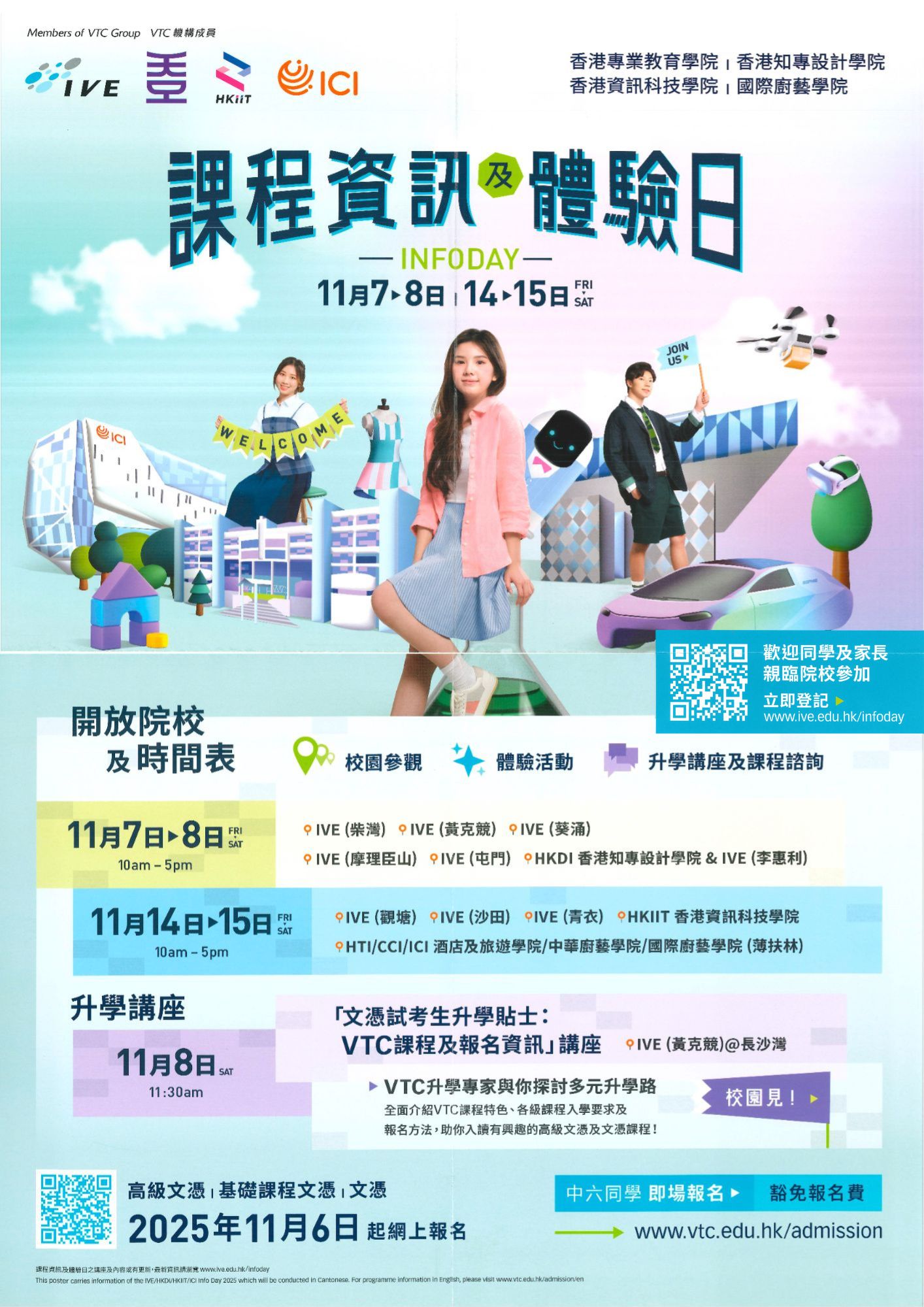 香港大學本科入學資訊日 日期:25.10.2025(星期六) 時間:09:00 – 18:00 地點:香港大學校園 活動詳情:https://www.infoday.hku.hk/ 報名方法(請參加的同學提早報名):https://hku.au1.qualtrics.com/jfe/form/SV_eRsXGNcBYqgmPOe 部分活動需要個別登記,詳情請瀏覽資訊日網頁。