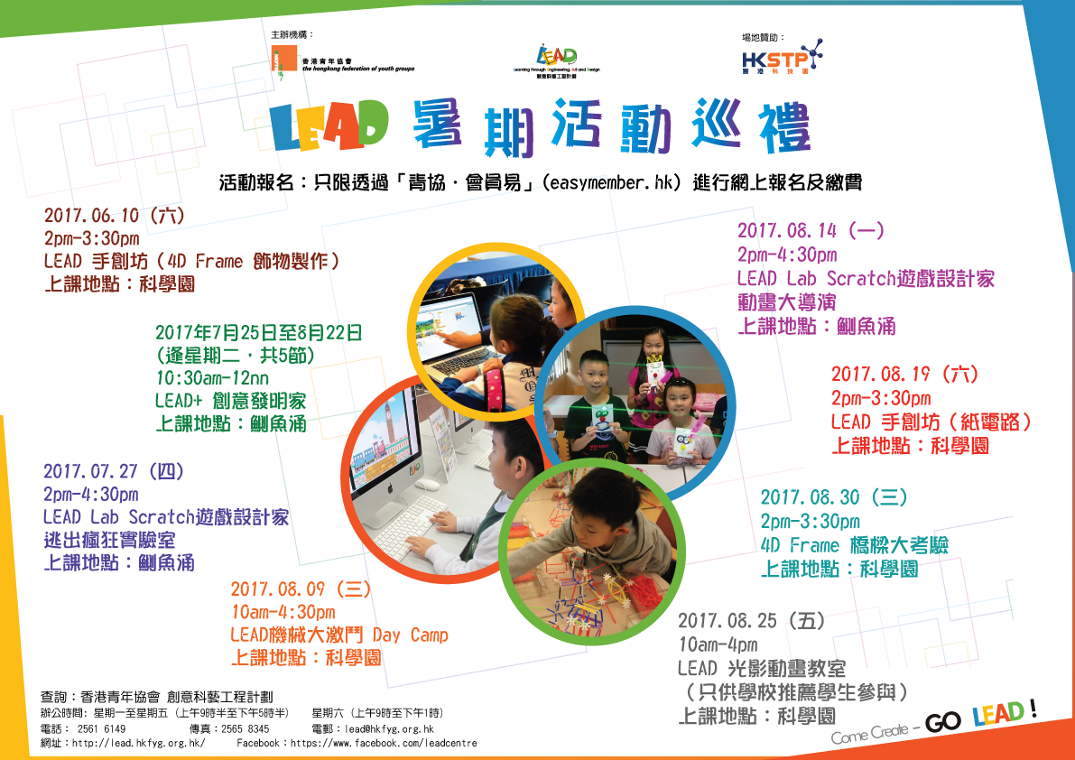 LEAD 暑期活動現正招生! 今年的活動主題包括科技、創新發明、創意科藝及設計等課程。名額有限,如欲報名請按以下連結。