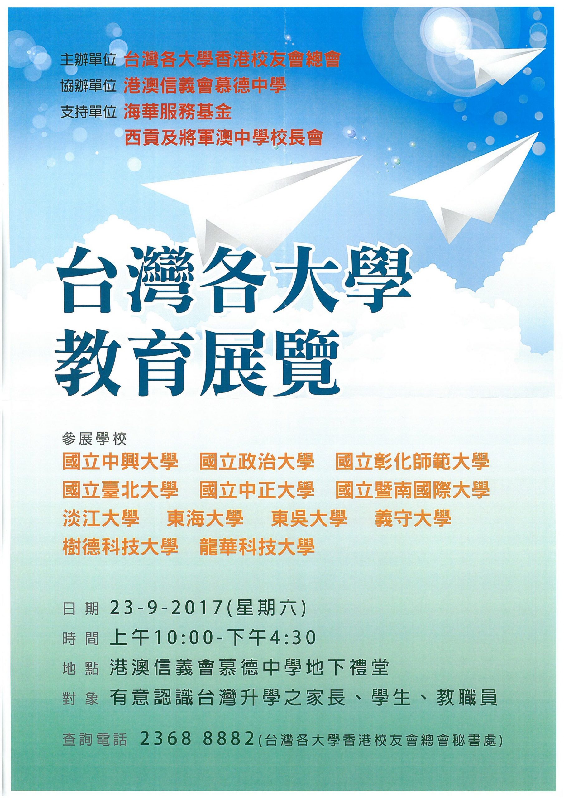 台灣各大學教育展覽 報名期限: 2017-09-23 日期: 2017年9月23日(六) 時間: 上午10:00-下午4:30 地點: 港澳信義會慕德中學地下學堂 對象: 有意認識台灣升學之家長、學生、教職員 查詢電話: 2368 8882