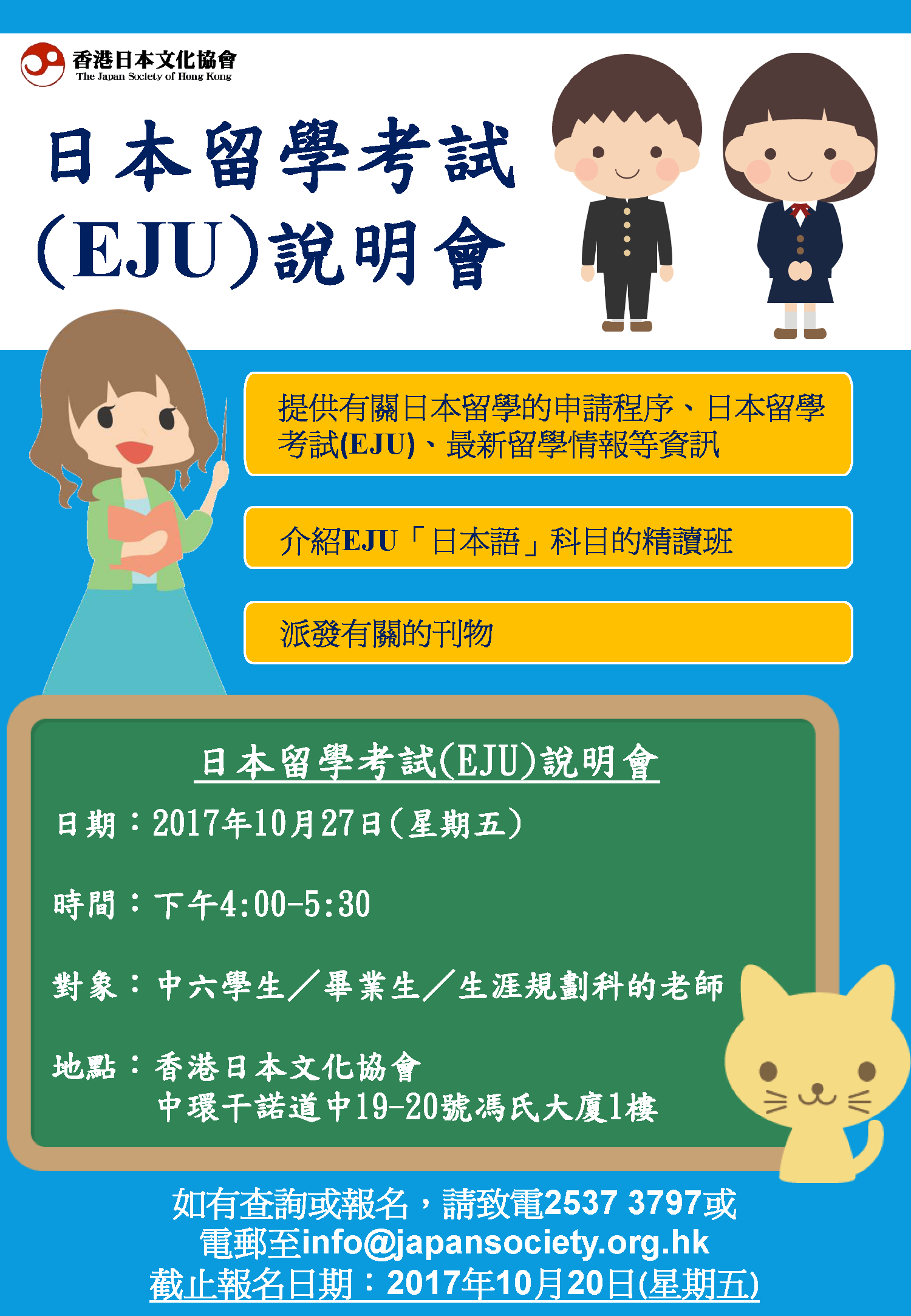 日本留學考試(EJU)說明會 報名期限: 2017-10-20 日期: 2017年10月27日(五) 時間: 下午4:00-5:30 對象: 中六學生/畢業生 地點: 香港日本文化協會 (中環干諾道中19-20號馮氏大廈1樓) 如欲報名,請致電 2537 3797 或電郵至 info@japansociety.org.hk 截止日期: 2017年10月20日(五) 是次活動不設帶隊,有興趣參加之學生,必須完成當天課堂,不設事假豁免。