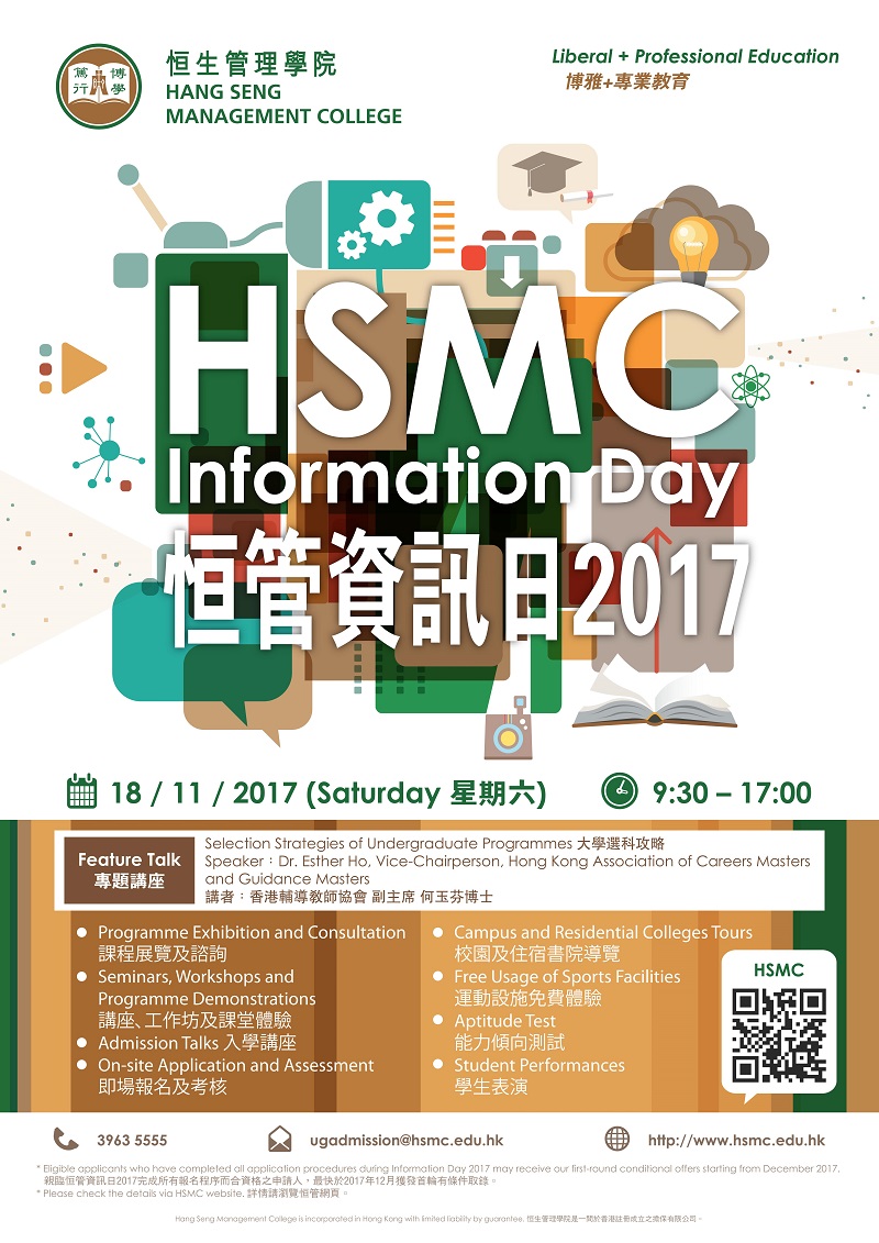 1. 參加者須即場填妥網上報名及繳交報名費(本地生每個課程港幣壹佰元) 2. 參加者請預先準備身分證及最近兩年校內成績表之電子檔,以便即時上載 3. 文憑試考生必須透過聯招(JUPAS)報讀指定專業/界別課程資助計劃(SSSDP)之課程 4. 11月18日當天只能親臨資訊日即場報名。恒管網上入學申請系統將於11月20日正式對外開放。 |