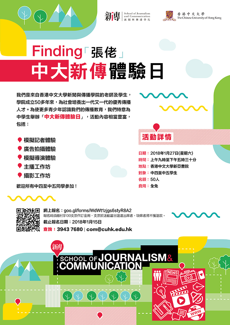 此體驗日旨在透過各種體驗活動、工作坊及遊戲,讓中學生了解本院的課程,初嚐傳播教育的滋味。讓參加者在活動中發掘對傳播學科的興趣,為日後升學及選科作準備。