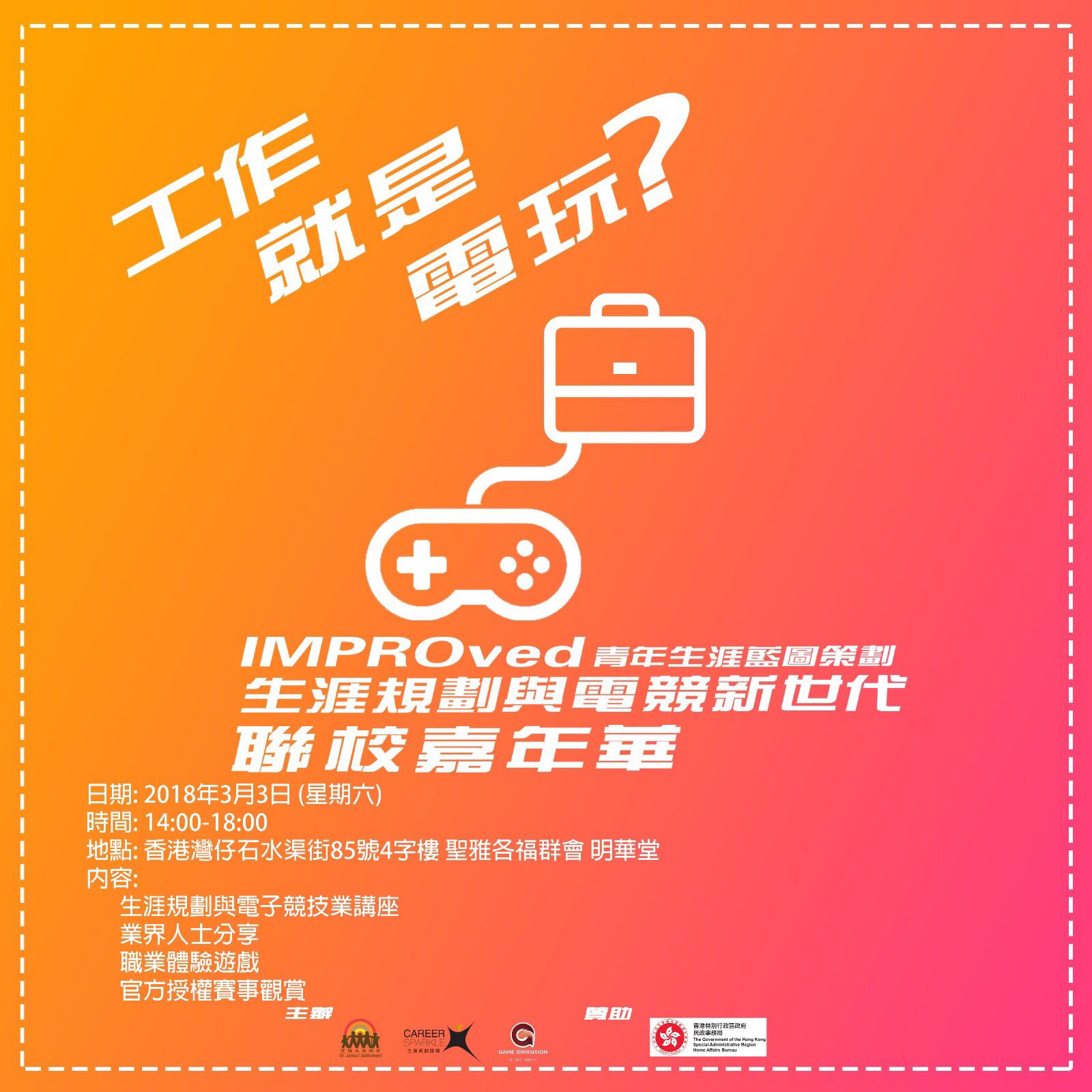 電 競 公 司 會 聯 同 中 學 學 生 舉 行 全港 中 學 電 競 嘉 年 華 。 嘉 年 華 內 容包 括 電 子 競 技 行 業 的 資 訊 、 業 界人 士 的 職 涯 分 享 及 職 業 體 驗 活動。 |