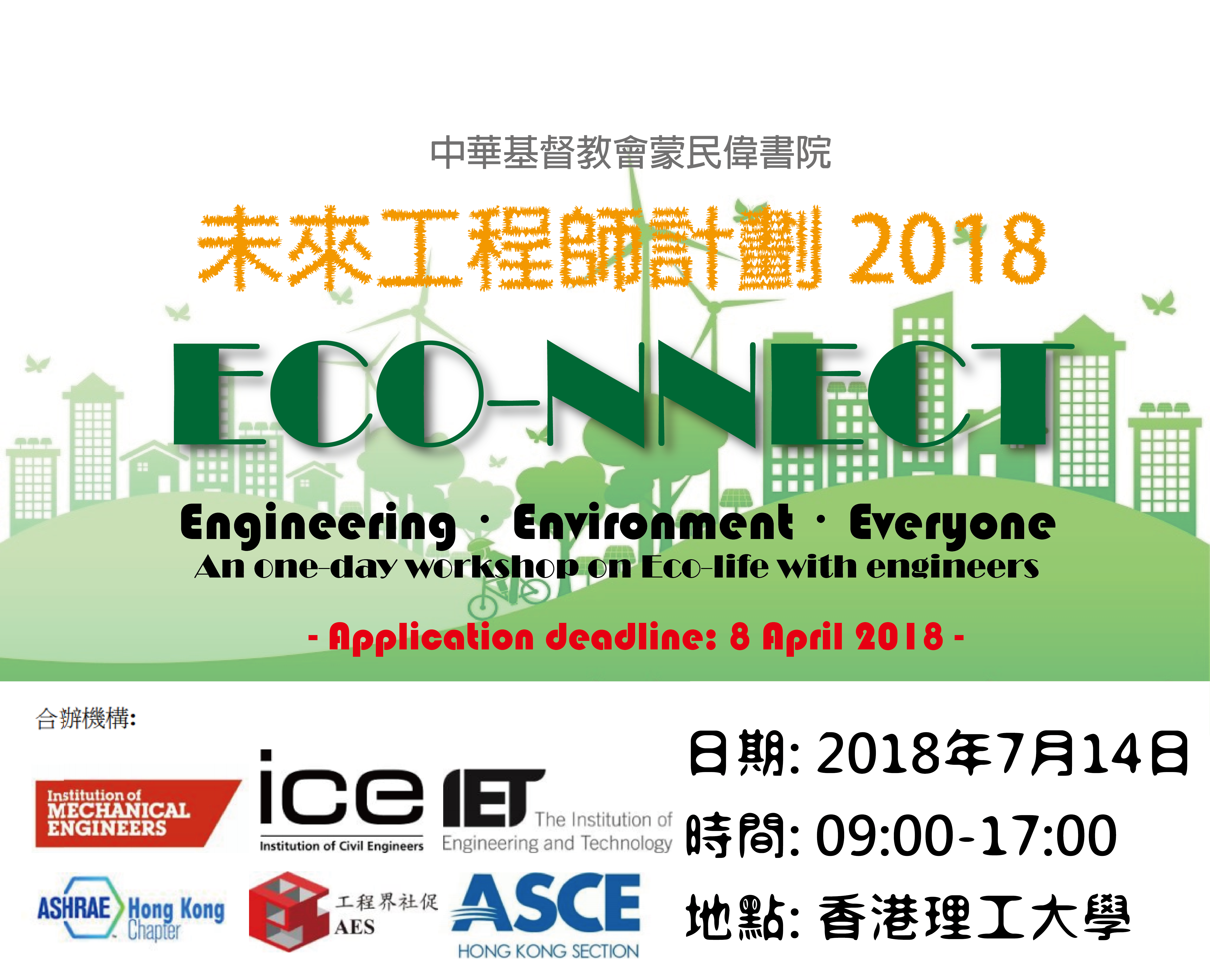 工程及科技學會(The IET)香港分會-青年會員部、英國土木工程師學會(ICE)香港分會- 青年部、美國供暖、製冷及空調工程師學會(ASHRAE)香港分會-青年會員部、英國機械工程師學會 (IMechE)香港分部-青年組及工程界社促會(AES) 及美國土木工程師學會(ASCE) -香港分會聯合舉辦的工作坊「ECO-NNECT」。