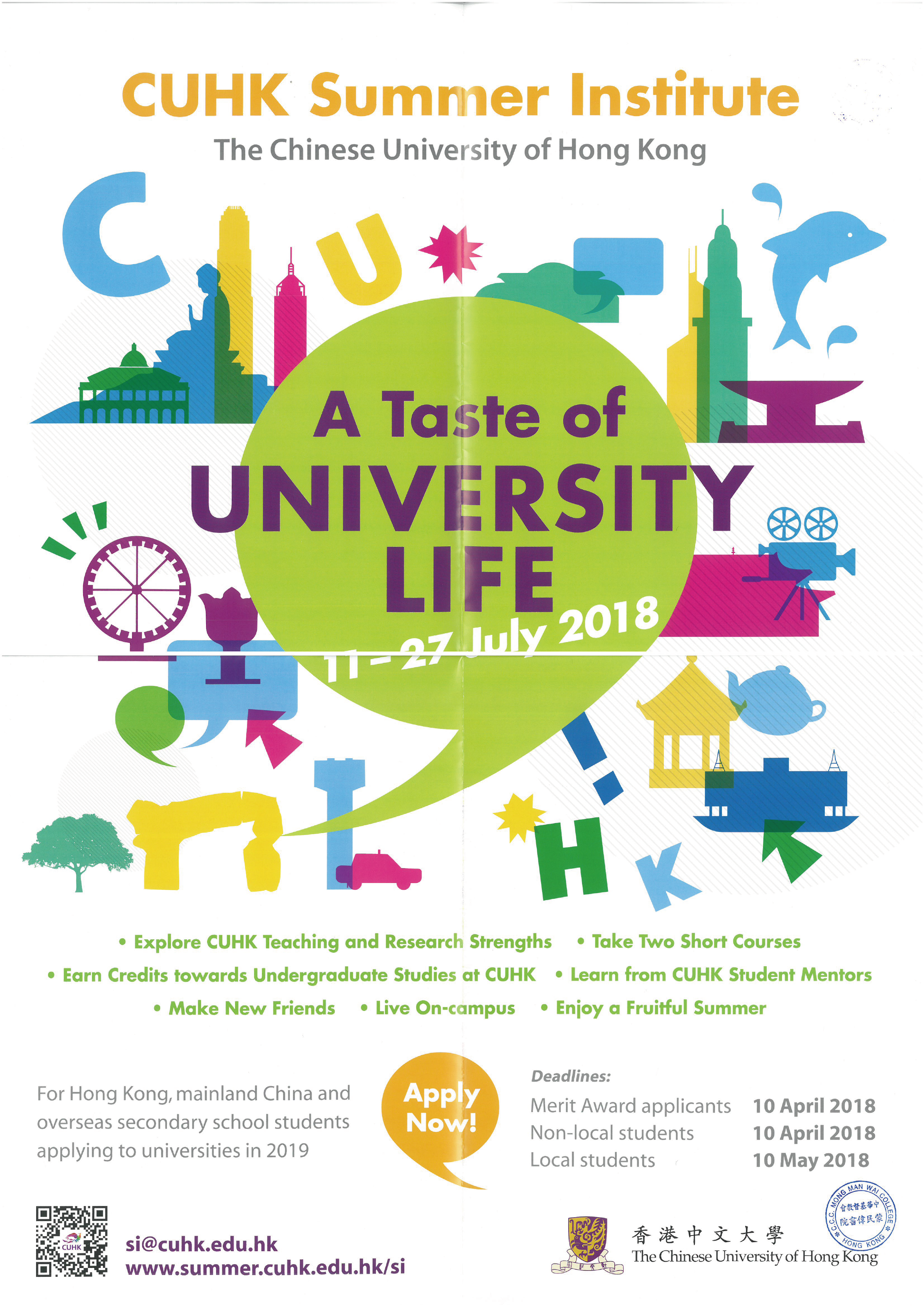 The CUHK Summer Institute (SI) is a two-week credit-bearing summer programme held in July at The Chinese University of Hong Kong (CUHK) campus. It brings together more than 300 enthusiastic learners from secondary schools in Hong Kong, mainland China and overseas to explore different academic fields at CUHK. The SI will not only challenge your inquisitive minds, it will also be an immersive experience into the lively CUHK campus for you.