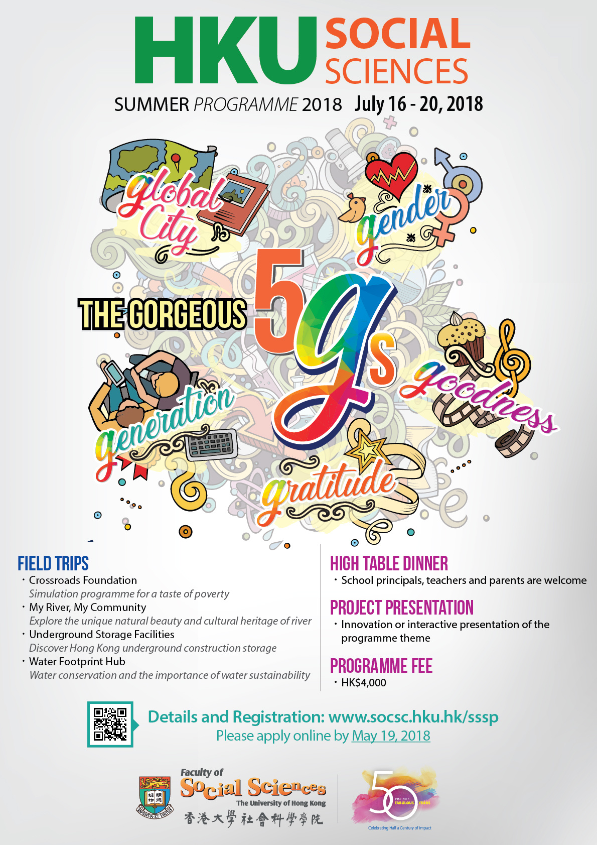 The summer programme is a brilliant way for students to explore diverse knowledge offered by the Faculty of Social Science, to meet with existing HKU students, and to experience hall life. The Gorgeous 5-“Gs” feature the Goodness of public and social services, the changes and gaps of Generations, the development and sustainability of Global Cities, the awakening and awareness of Gender issues, as well as the science and nature of the human Gratitude.