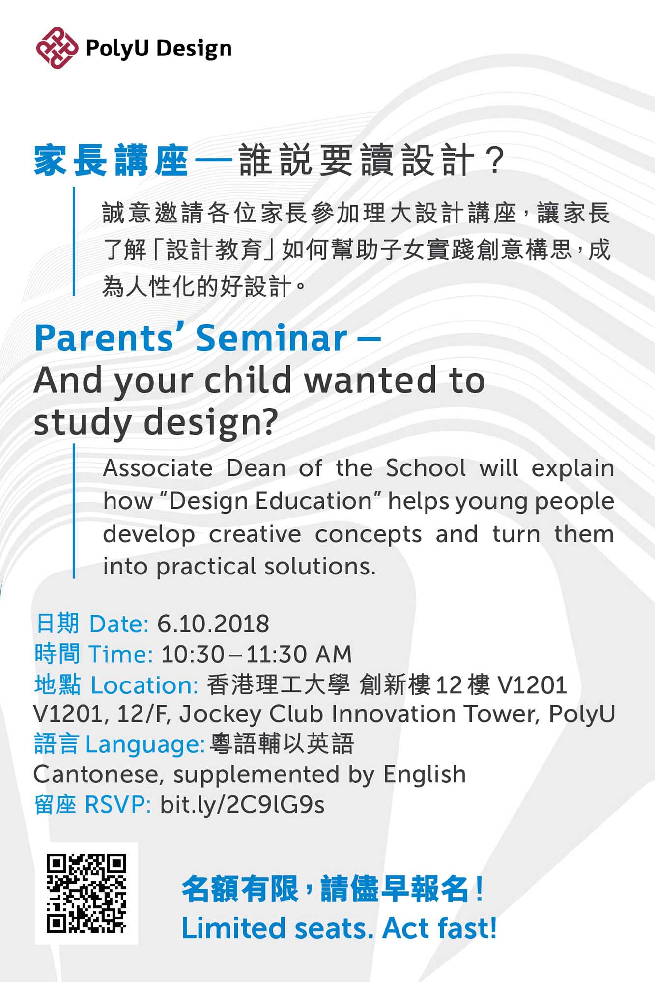 是次講座將由理大設計學院副院長蕭競聰先生為家長解開公眾對設計教育的迷思。大學課程除了讓子女學習設計理論並將之應用於不同的實際層面之外,亦會教導學生如何應用「設計思維」為未來、為社會、為環保作出貢獻。