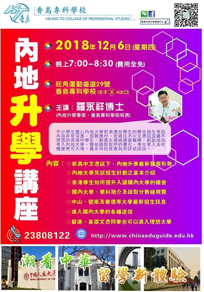 香島專科學校將於2018年12月6日(星期四)舉辦內地升學講座。