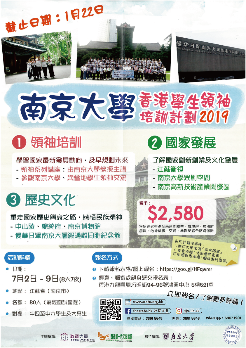 為了發掘及培育學生領袖,政賢力量聯同香港新一代文化協會、南京大學,將於2019年暑假舉辦「南京大學香港學生領袖培訓計劃2019」。組織80位高中生及大專生領袖,一同考察充滿歷史文化特色的南京市,探索當地的城市發展定位、歷史建築、文化遺跡、經濟發展、創新創業,了解當地人民的生活狀況。參加者也可透過一系列的領袖培訓活動,全面提升多元領袖才能。