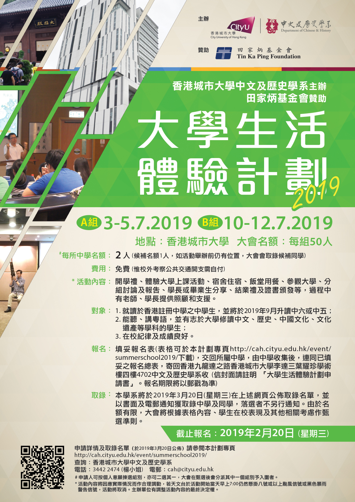 填妥報名表,交回所屬中學,由中學收集後,連同已填妥之報名總表,寄回香港九龍達之路香港城市大學李達三葉耀珍學術樓四樓4702中文及歷史學系收 (信封面請註明 「大學生活體驗計劃申請書」。報名期限將以郵戳為準)