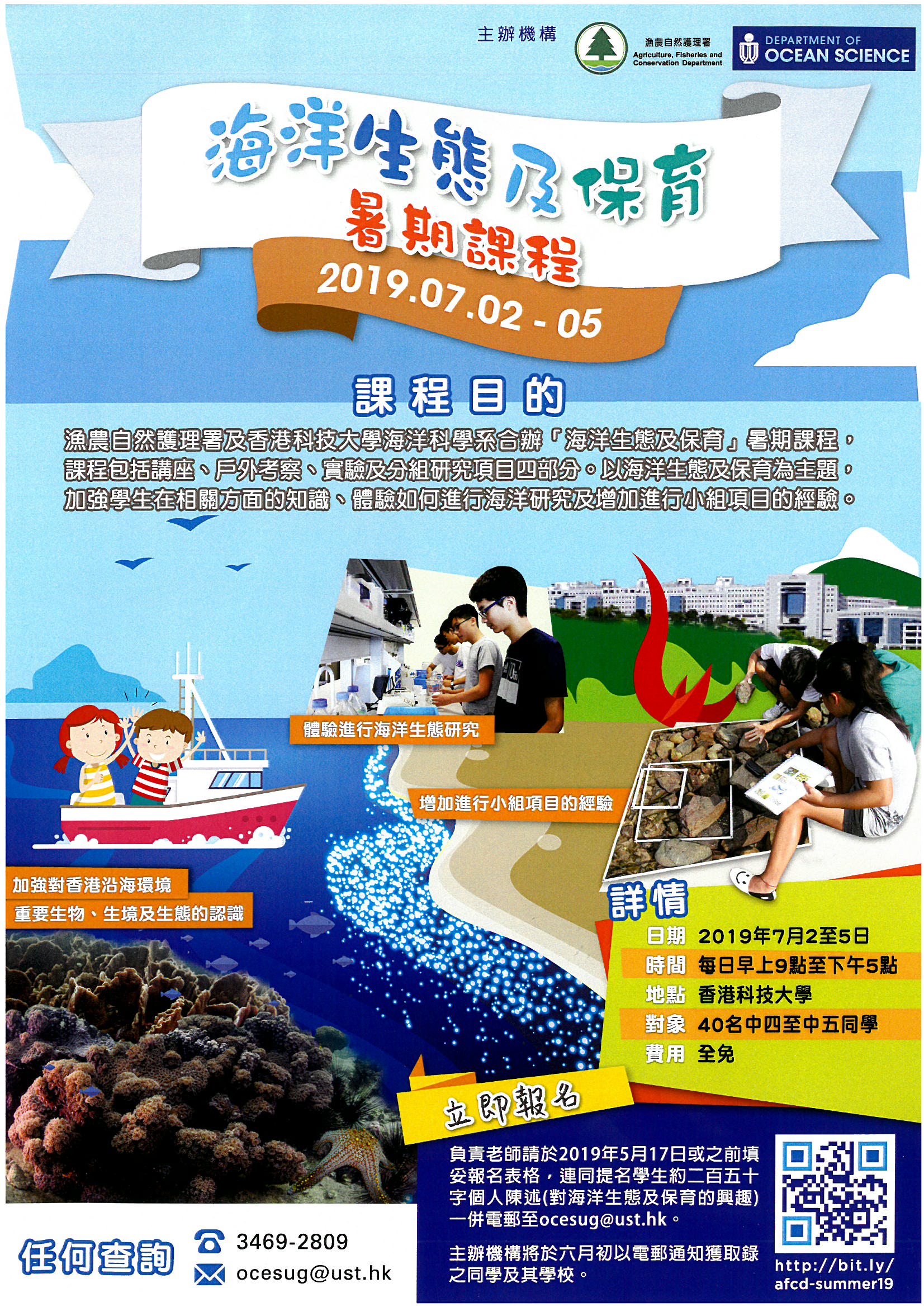 漁農自然護理署及香港科技大學海洋科學系合辦「海洋生態及保育」暑期課程,課程包括講座、戶外考察、實驗及分組研究項目四部份。以海洋生態及保育為主題,加強學生在相關方面的知識、體驗如何進行海洋研究及增加進行小組項目的經驗。