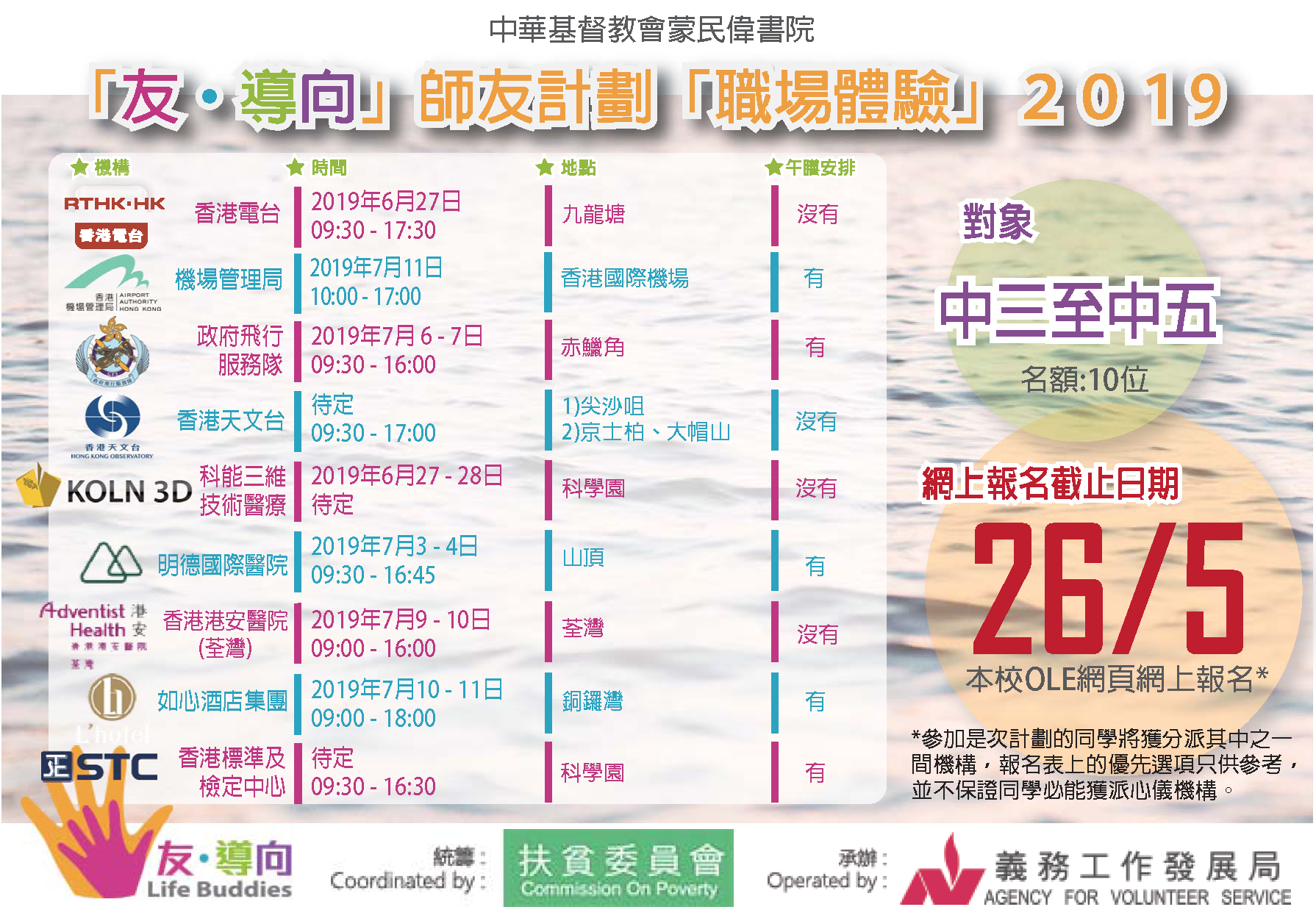 由於活動項目名額有限,鼓勵學生嘗試不同類型的項目,珍惜所有獲分配的名額,積極參與,不要輕易放棄任何機會。不論是哪一個項目,學生必能在職場體驗的過程當中,獲得寶貴的知識及經驗。。