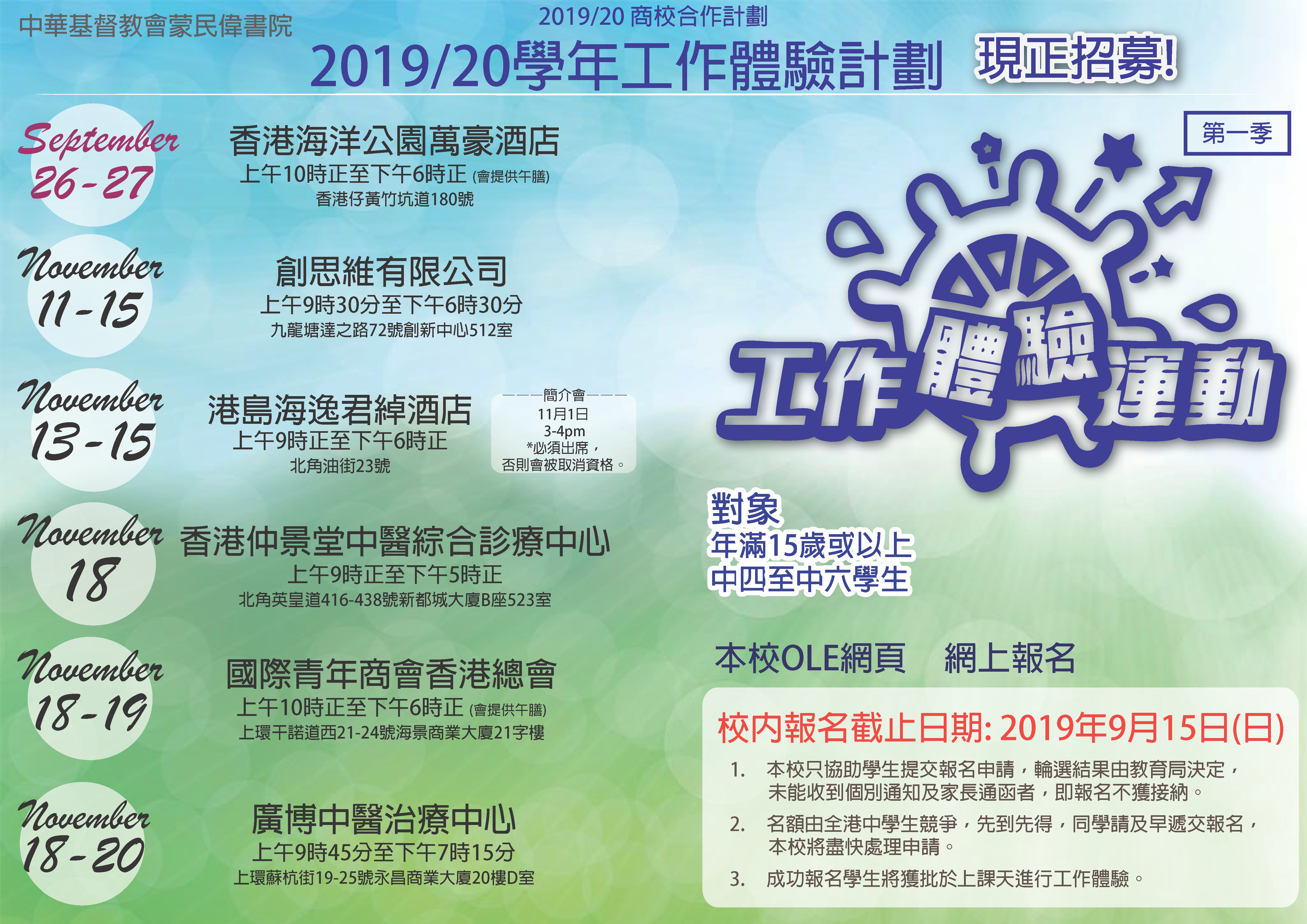11月1日下午3至4時於工作地點進行l   會提供午膳l   學生必須出席簡介會,缺席者會被取消資格/不獲發參與證書