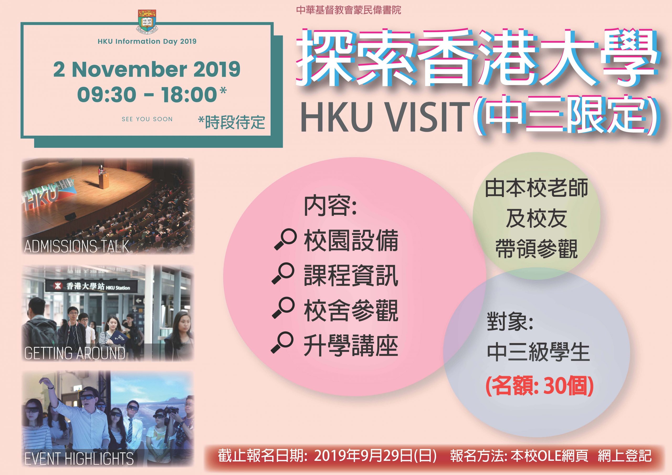 19-20 中三級 探索香港大學 報名期限: 2019-09-29 活動日期: 2019年11月2日 活動時間: 待定 活動地點: 香港大學 對象: 中三學生 名額: 30人 截止日期: 2019年9月29日(日) 立即網上報名