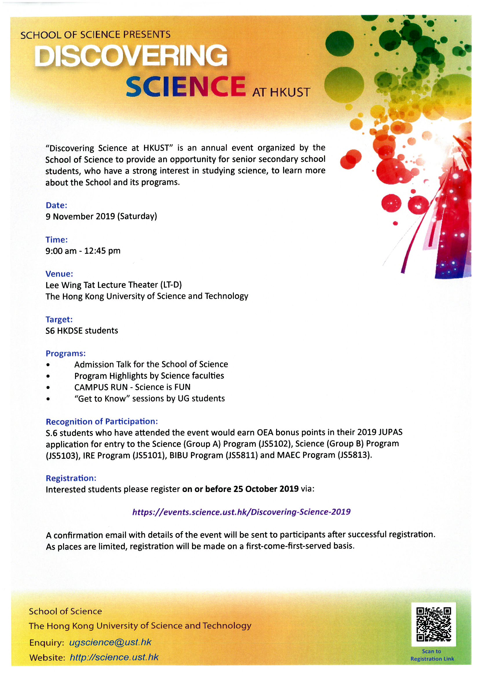 S.6 students who have attended the event would earn OEA bonus points in their 2019 JUPAS application for entry to the Science (Group A) Program (JS5102), Science (Group B) Program (JS5103), IRE Program (I55101), BIBU Program (JS5811) and MAEC Program (JS5813).
