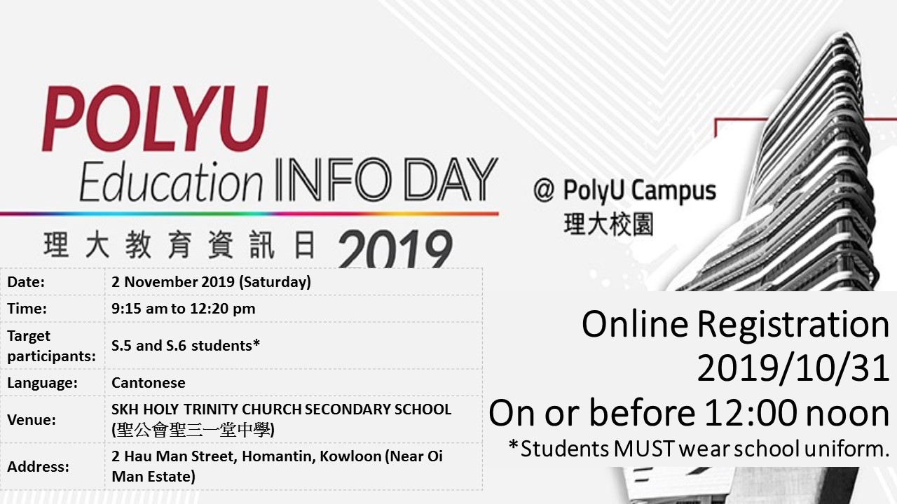 In view of the cancellation of our Education Info Day on 5 October 2019, we will conduct a district-based seminar on Undergraduate Programmes at SKH Holy Trinity Church Secondary School (close to Homantin MTR station) on the morning of 2 November 2019 (Saturday). Secondary 5 & 6 students are welcome to join.