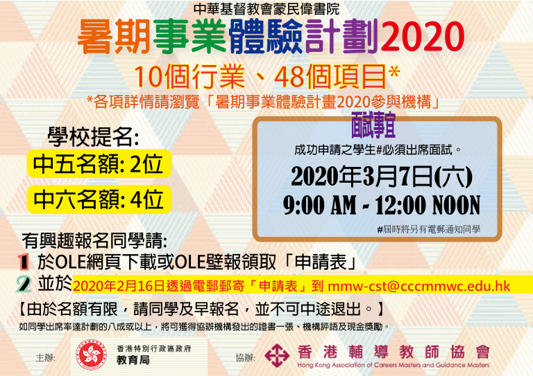 2. 並於2020年2月16日或以前透過電郵將「申請表」寄到 mmw-cst@cccmmwc.edu.hk