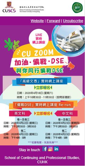 | 中學文憑試考試在即,CUSCS全力為考生加油打氣,舉辦「CU Zoom:備戰・加油・DSE」實時網上講座系列,由學院講師分享中英文閱讀、寫作、聆聽與綜合能力試卷的應考心得、重點分析近年考題趨勢及題型,並在直播中解答同學的提問,幫助考生掌握答題技巧及其他需要注意的事項。