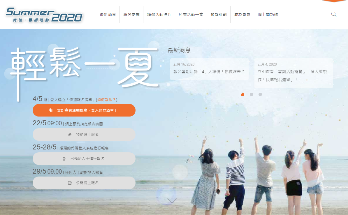 青協 ‧ 暑期活動Summer2020 「輕鬆一夏」 報名期限: 2020-06-10 官方網站:https://summer.hkfyg.org.hk/ 精選活動推介 Wellness Arts 全健藝術 Wellness Sports 全健運動 Summer Schools 夏令營 Future Skills 未來技能 Local Exposure 探索香港 Online Courses 線上課程 查看所有10,000個暑期活動
