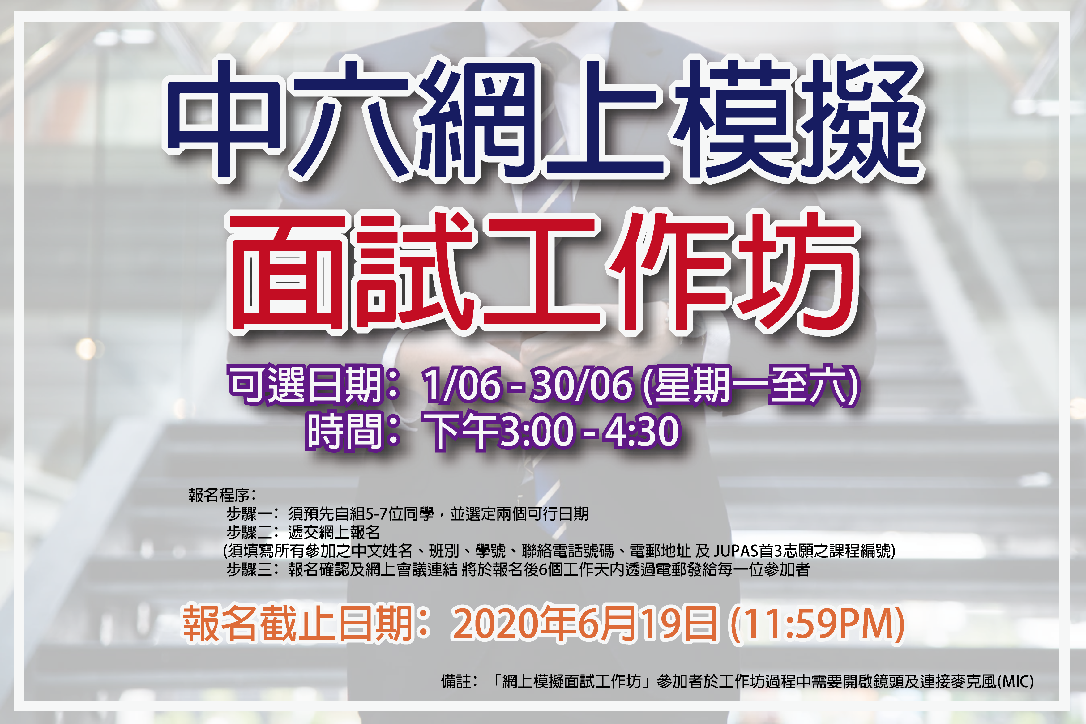 為協助中六學生更好地應對接下來的JUPAS課程面試,本校特聯同聖雅各福群會安排網上模擬面試工作坊,供同學練習,及早做好準備。