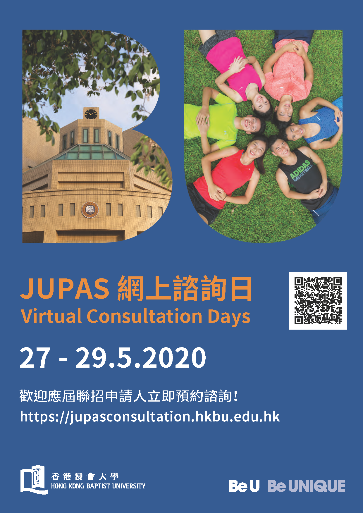 香港浸會大學JUPAS網上諮詢日 報名期限: 2020-05-29 https://jupasconsultation.hkbu.edu.hk/index.html 活動一覽 List of all events 27 May 2020 28 May 2020 29 May 2020 課程簡介|PROGRAMME BRIEFINGS 文學院|FACULTY OF ARTS 工商管理學院|SCHOOL OF BUSINESS 中醫藥學院|SCHOOL OF CHINESE MEDICINE 傳理學院|SCHOOL OF COMMUNICATION 理學院|FACULTY OF SCIENCE 社會科學院|FACULTY OF SOCIAL SCIENCES 視覺藝術院|ACADEMY OF VISUAL ARTS 課程概覽|PROGRAMMES ON OFFER
