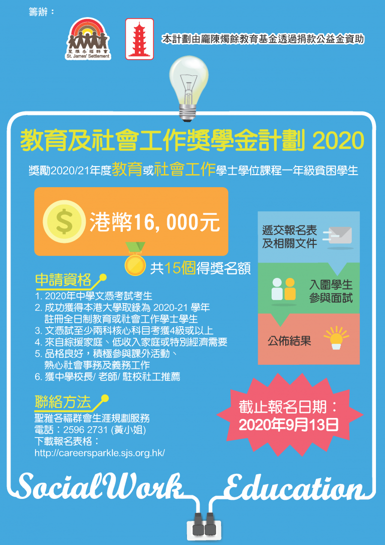 聖雅各福群會於2020-2021學年獲龐陳燭餘教育基金及香港公益金委任籌辦「教育及社會工作獎學金計劃2020」,目的是獎勵本港中學文憑試成績優異及即將在2020/21年度修讀本地註冊全日制教育或社會工作學士學位課程一年級的貧困學生。成功得獎的 15位學生 每人可獲發放一筆過 港幣16, 000元獎學金。