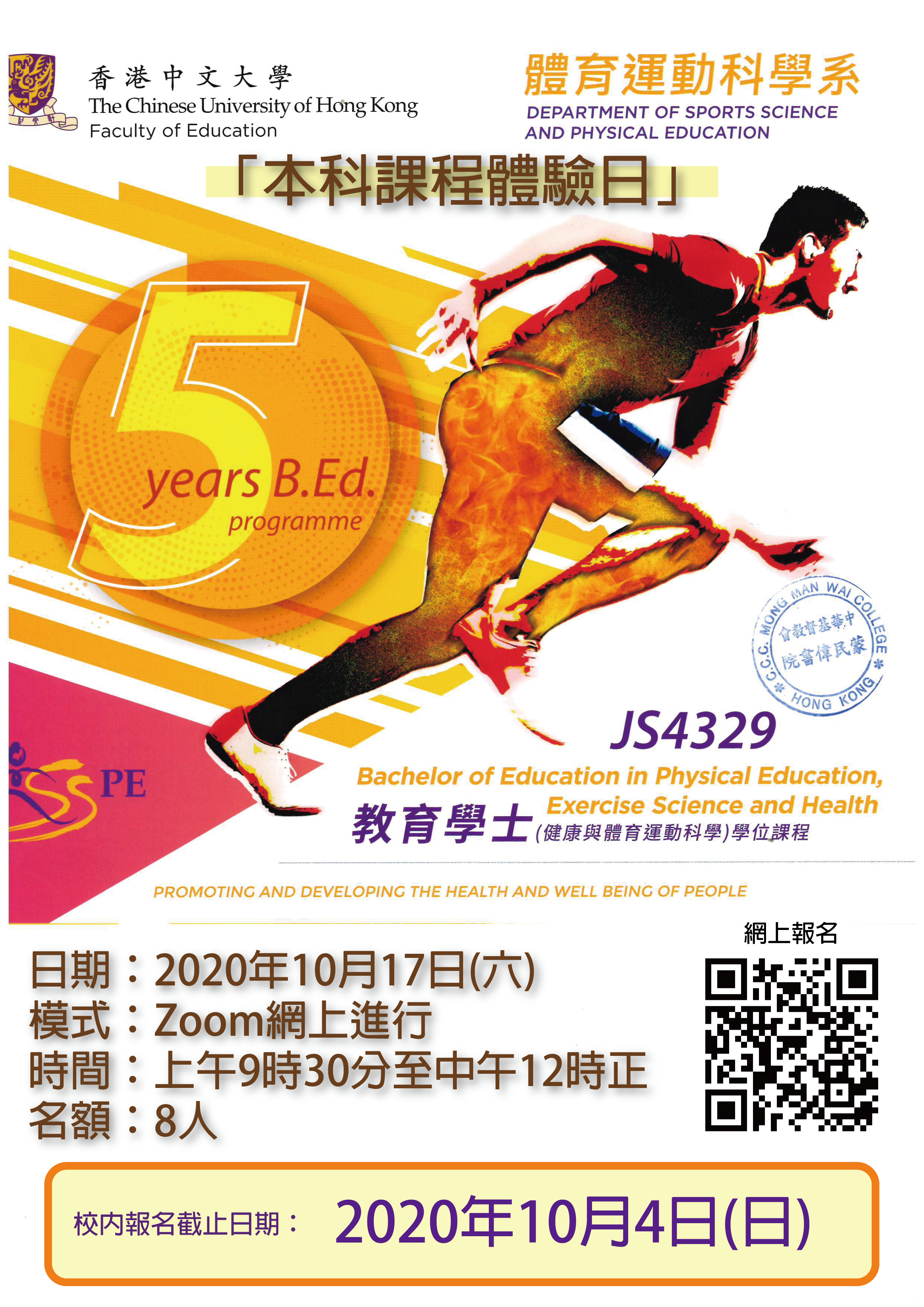 由香港中文大學體育運動科學系提供的健康與體育運動科學教育學士學位課程,自開辦以來深受學生歡迎。此課程旨在培養優質體育教師、教練及體育運動管理人才。為了讓中六學生更能了解該課程的特色,院校擬定於本年度舉行兩次「本科課程體驗日」。第一次活動的詳情如下: