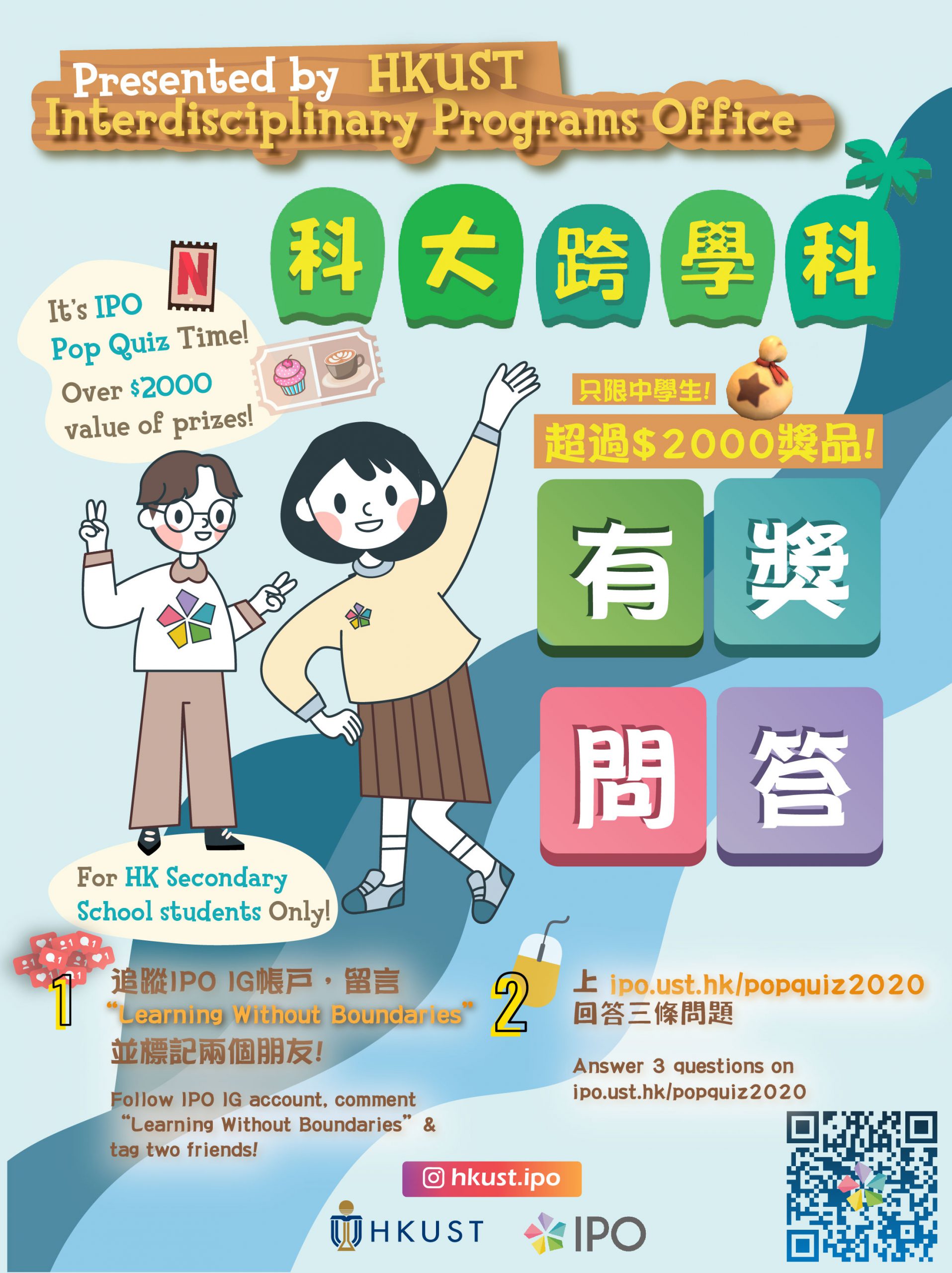Interdisciplinary Programs Office (IPO) of HKUST is going to organize The IPO Pop Quiz for all Hong Kong high school students to know more about the three undergraduate programs offered by IPO: Dual Degree Program in Technology & Management (JS5901), BSc in Environmental Management & Technology (JS5812) and BSc in Individualized Interdisciplinary Major.