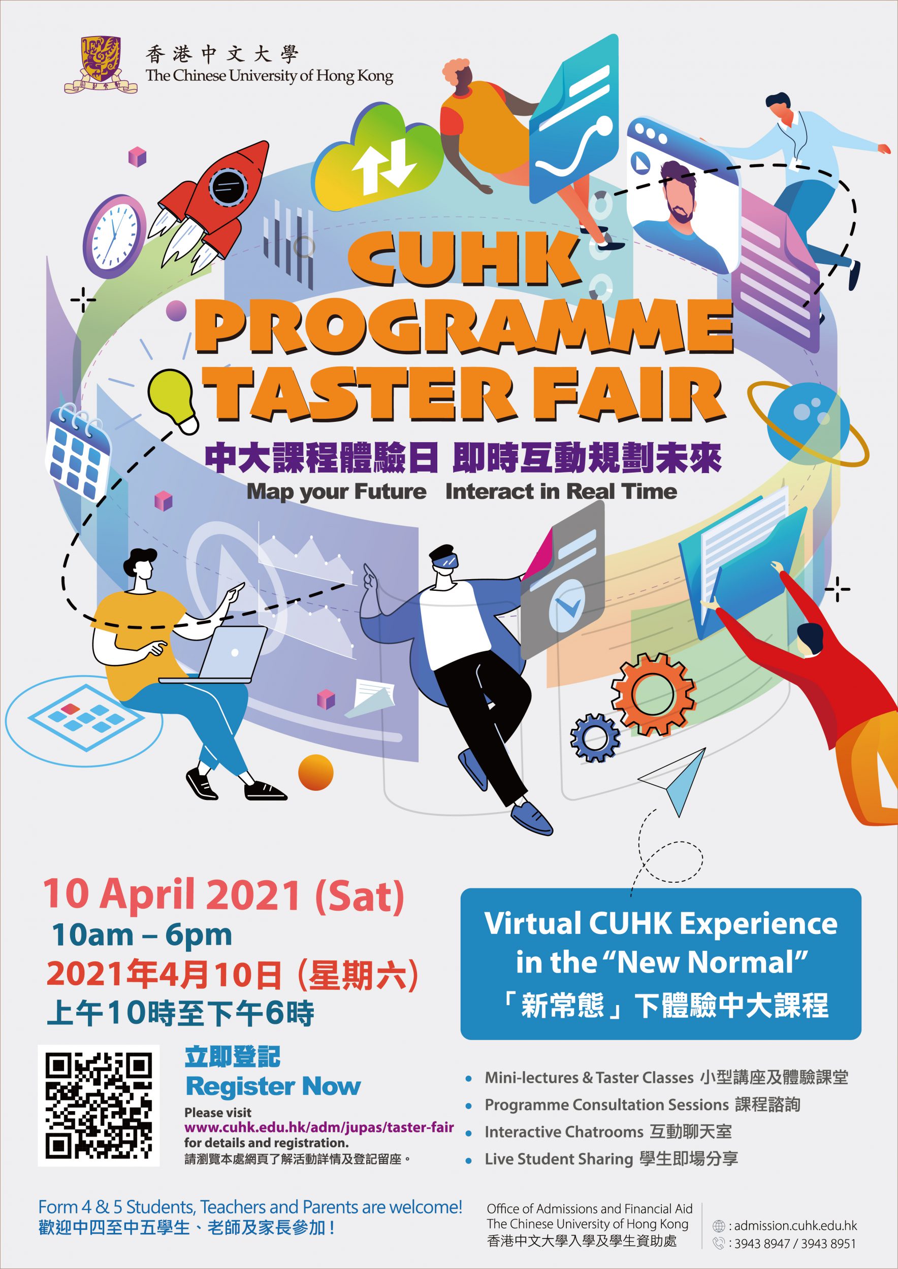 The Chinese University of Hong Kong (CUHK) will organise a virtual Programme Taster Fair on 10 April 2021 (Saturday). The event aims to provide senior secondary school students in Secondary 4 and Secondary 5 with a taster experience of the major programmes offered by the University.