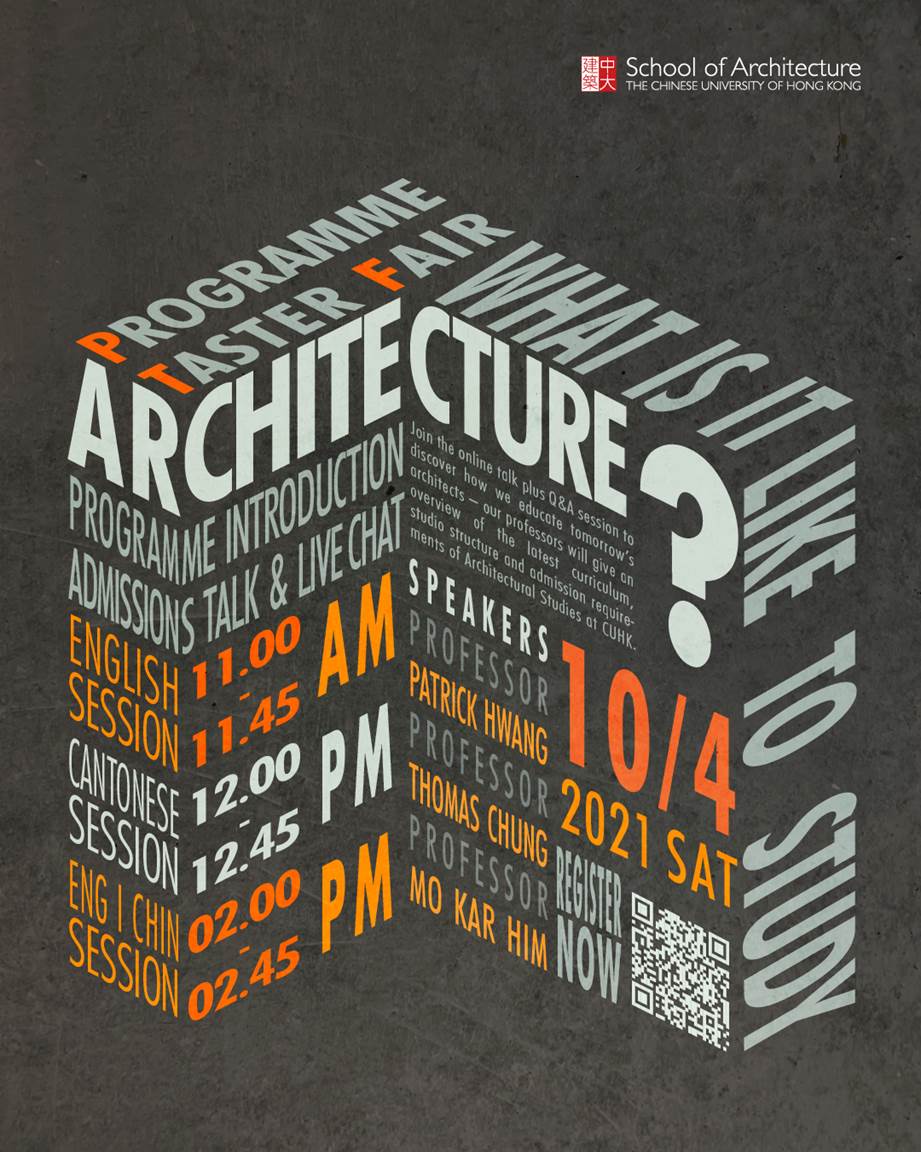 Join the online talks plus Q&A session to discover how we educate tomorrow’s architects – our professors will give an overview of the latest curriculum, studio structure and admission requirements of Architectural Studies at CUHK.