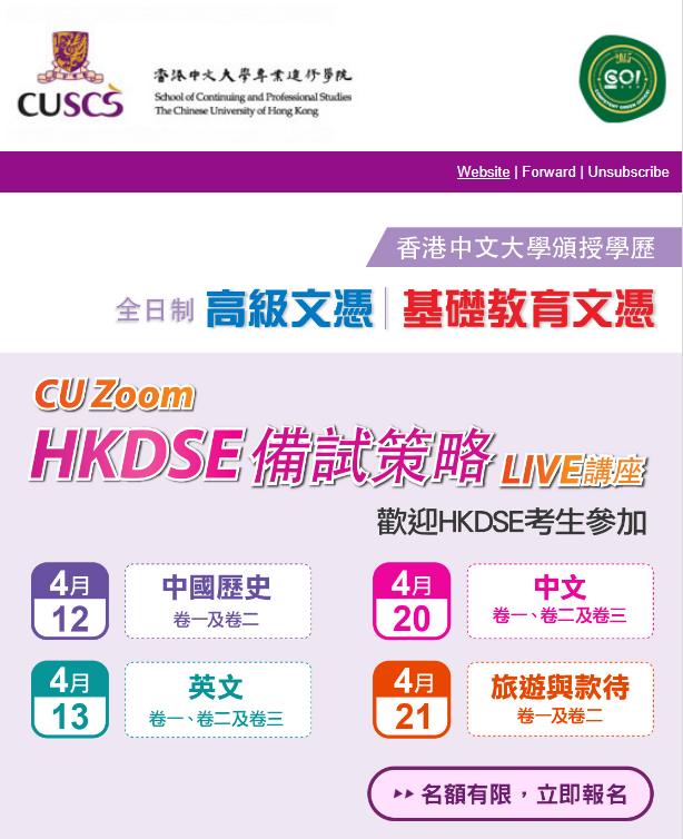 中學文憑試開考在即,香港中文大學專業進修學院(CUSCS)全力為考生加油打氣,特別舉辦「HKDSE備試策略」網上講座,由學院講師分享中文、英文、中國歷史及旅遊與款待各科的備試心得,重點分析近年考題趨勢及題型,即時解答同學的提問,幫助考生掌握答題技巧及需要注意事項。