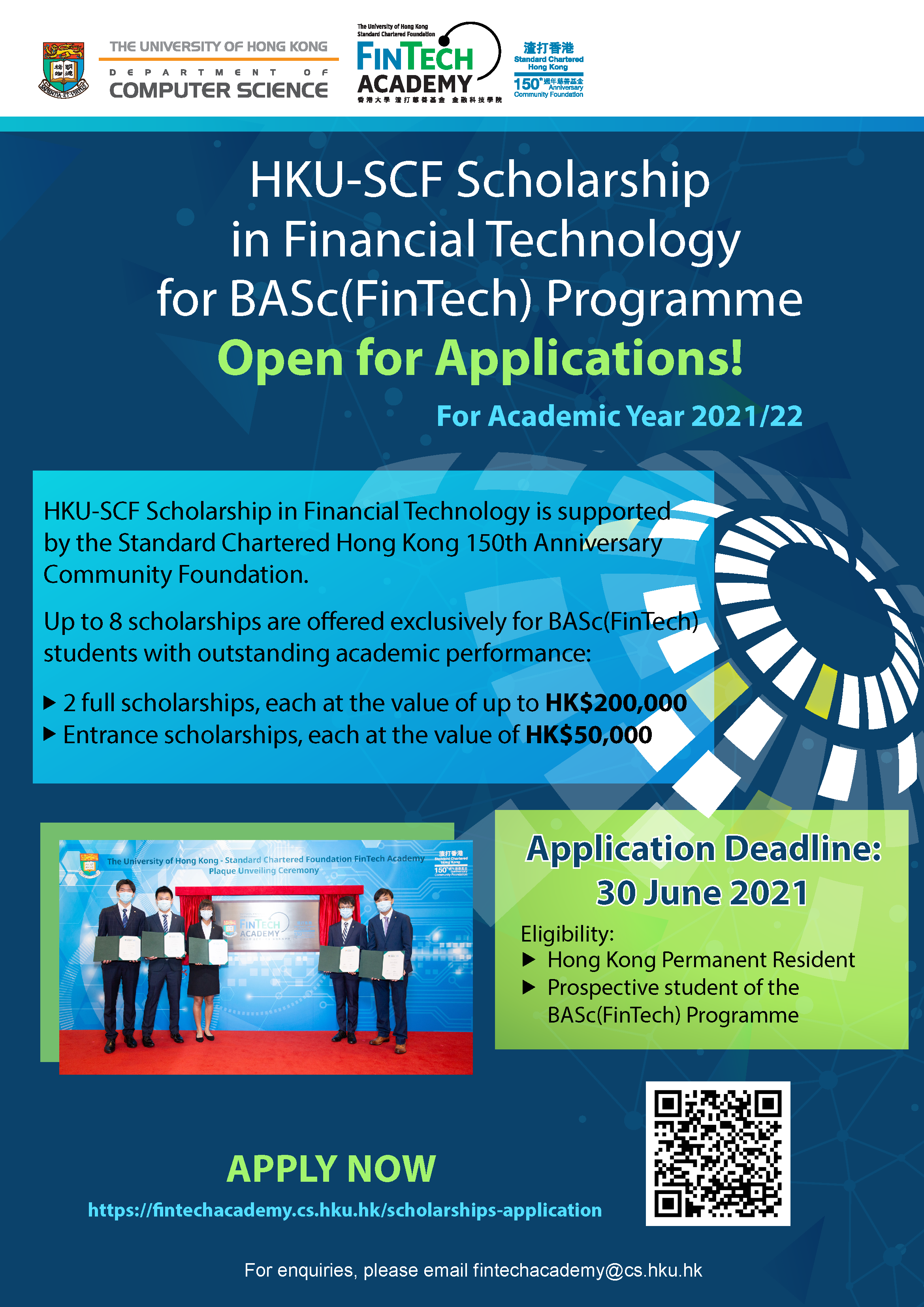 HKU-SCF Scholarship in Financial Technology is one of the initiatives of the HKU-SCF FinTech Academy, supported by the Standard Chartered Hong Kong 150th Anniversary Community Foundation, aiming to attract and nurture elite students who will be supporting the future development of FinTech in Hong Kong and other parts of the world.