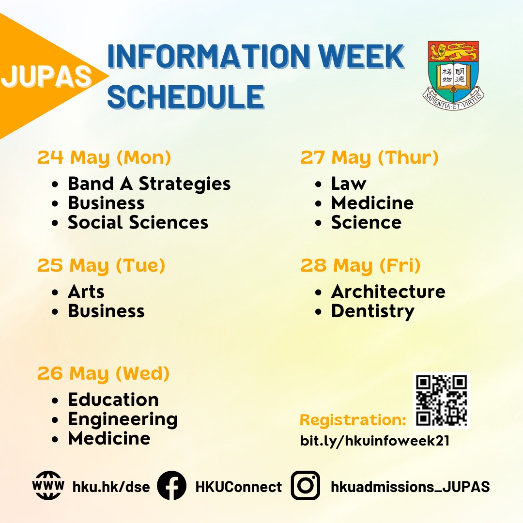港大將於5月24日至28日期間為應屆聯招考生舉行《港大本科入學資訊週2021》,十個學院都會有精彩活動,包括課堂體驗、教學設施參觀、學生分享及入學講座,學生可以多角度了解課程特色及優勢、學習機會、入學要求等,獲取最切身的JUPAS入學及港大課程的最新資訊。