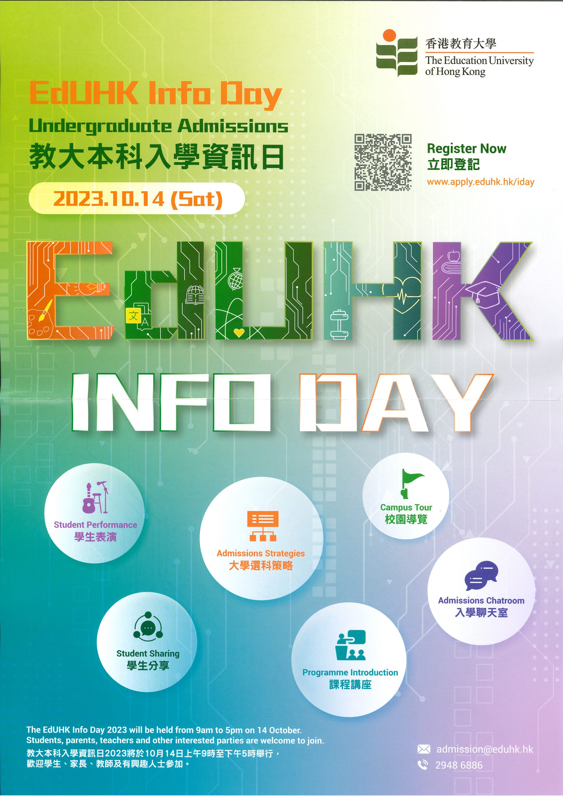 同學可於2023年10月14日親臨教大校園與教大師生互動交流,並通過一連串精彩活動,了解更多課程入學資訊以及教大校園生活,部份活動將提供網上同步直播。