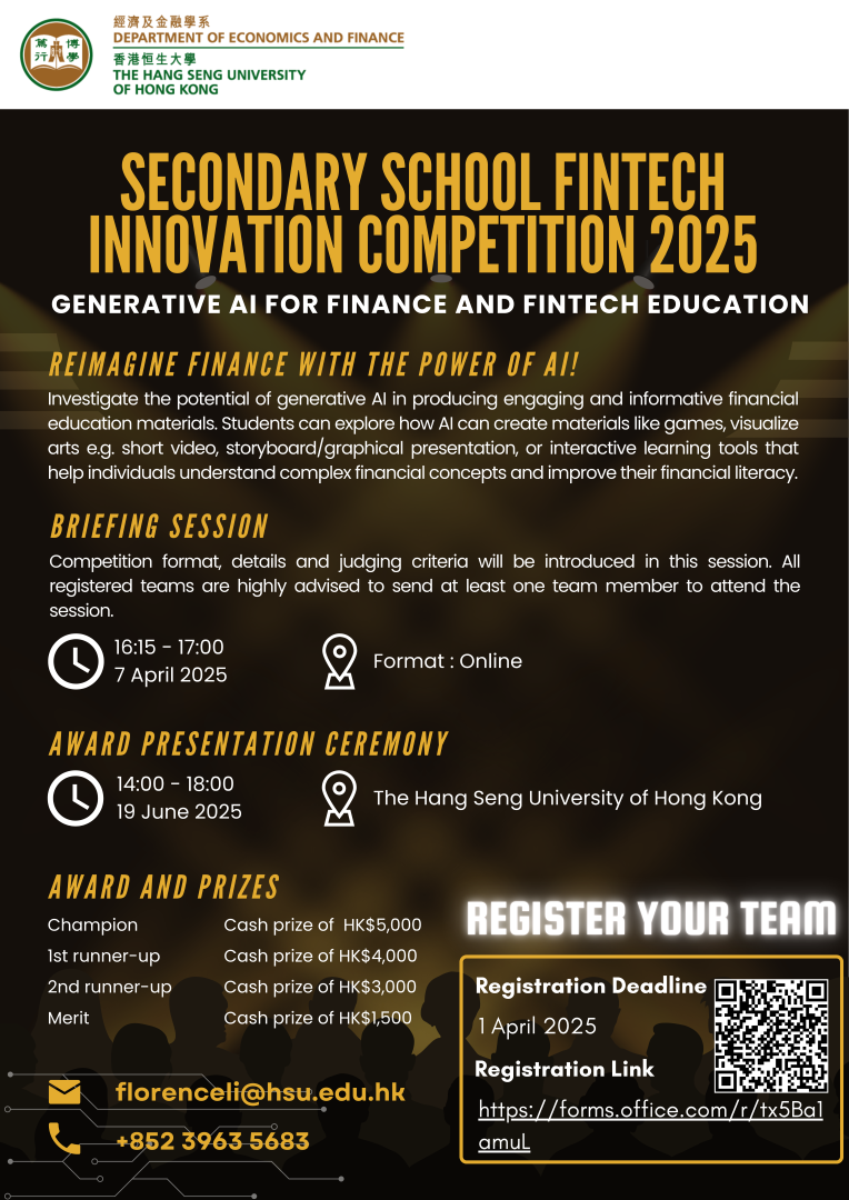 查詢: 李女士(Florence Li),金融科技 – 經濟及金融學系 郵箱:florenceli@hsu.edu.hk 電話:+852 3963 5683