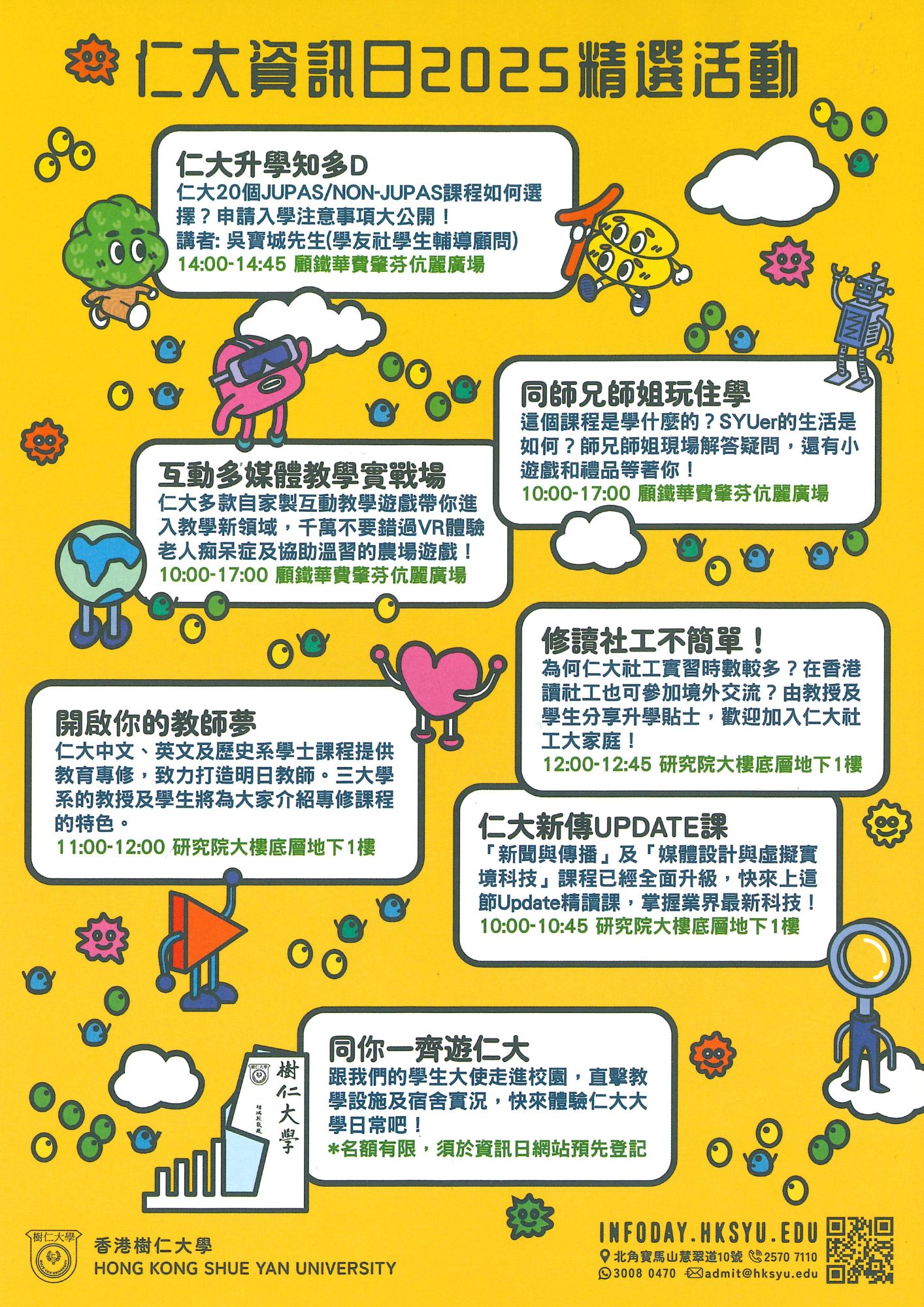 HKSYU Info Day 2025 香港樹仁大學資訊日2025 日期:15.11.2025(星期六) 時間:10:00 – 17:00 地點:北角寶馬山慧翠道6-12號香港樹仁大學校舍 活動詳情:https://infoday.hksyu.edu/zh-hant/或掃描QRcode