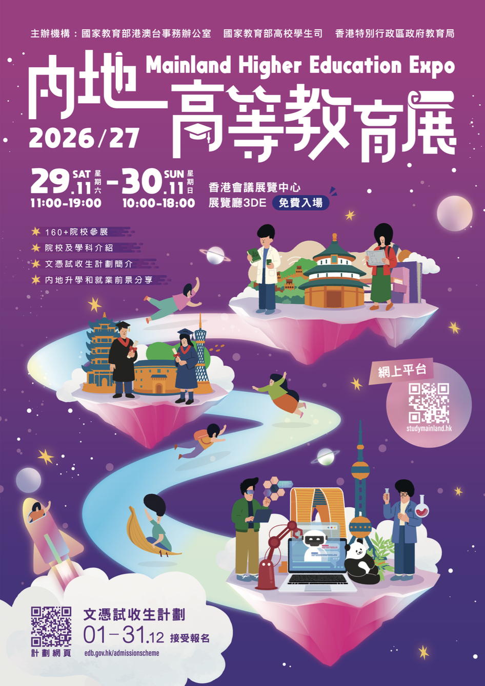 2026/27內地高等教育展 日期及時間: 2025年11月29日(星期六)上午11時至下午7時 2025年11月30日(星期日)上午10時至下午6時 地點: 香港會議展覽中心展覽廳3DE 活動詳情:www.studymainland.hk或掃描QRcode