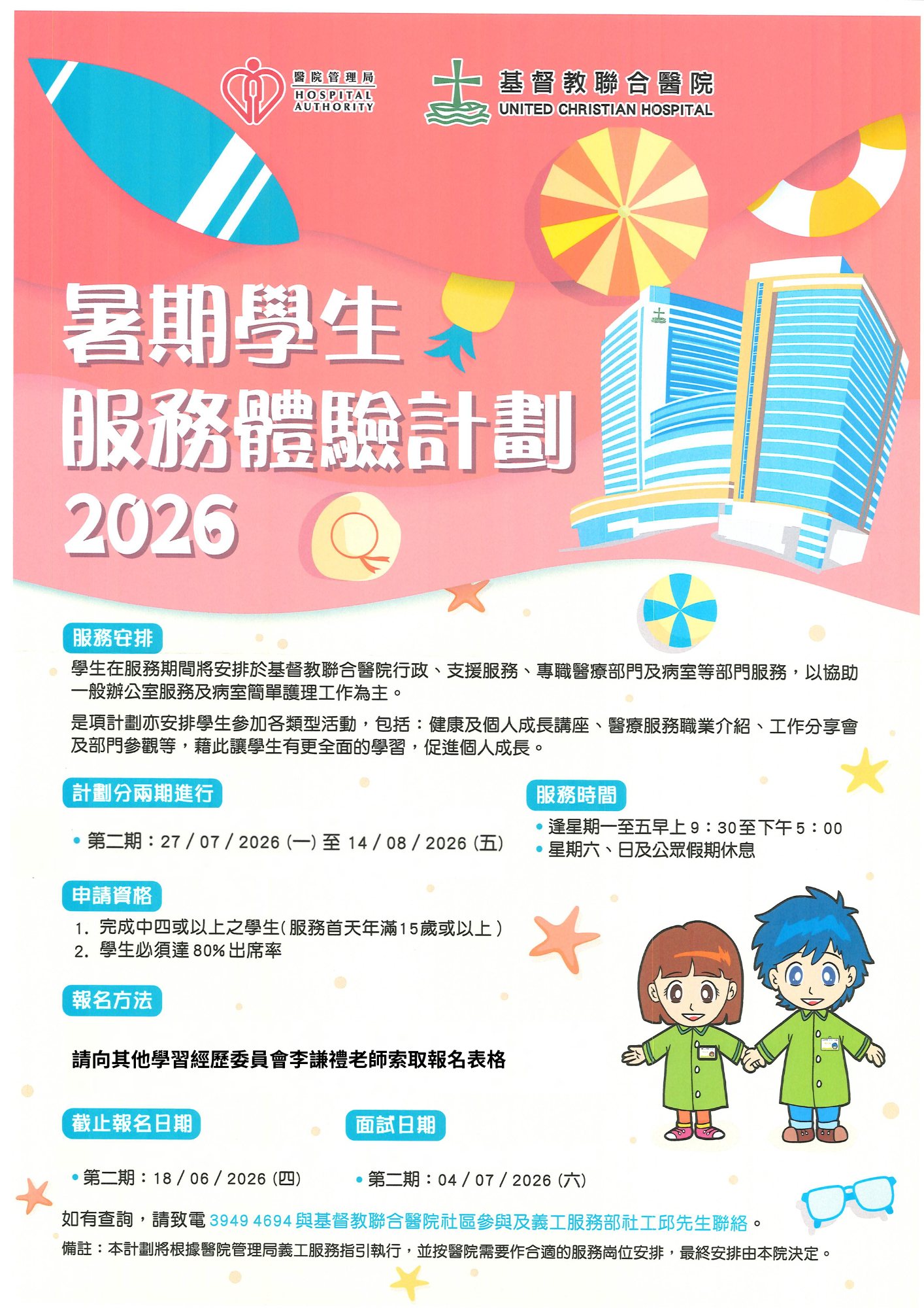 服務安排:學生在服務期間將安排於基督教聯合醫院行政、支援服務、專職醫療部門及病室等部門服務,以協助一般辦公室服務及病室簡單護理工作為主。是項計劃亦安排學生參加各類型活動,包括:健康及個人成長講座、醫療服務職業介紹、工作分享會及部門參觀等,藉此讓學生有更全面的學習,促進個人成長。
