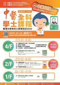 香港大學本科入學資訊日-中醫全科學士課程將於10月25日(六)舉行,詳情如下: 日期:2025.10.25 (星期六) 時間:09:00-18:00 地點:薄扶林沙宣道3號醫學院學術樓2樓及4樓 「中醫全科學士課程」入學講座 時間:11:30am-12:45pm 地點:沙宣道3號醫學院學術樓1樓LT2 報名連結:請按此 中藥香囊製作及耳穴貼壓工作坊