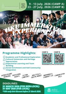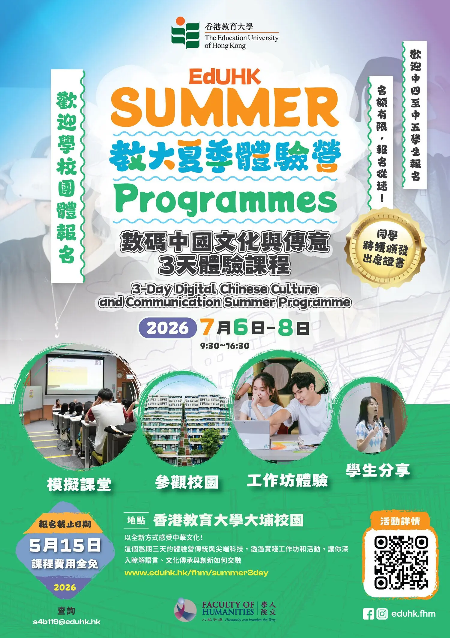 以全新方式感受中華文化!這個為期三天的體驗營融合傳統與尖端科技,透過實踐工作坊和精彩活動,讓你深入瞭解語言、文化傳承與創新如何交融。 對象:中四至中五學生 日期:2026年7月6至8日(星期一至星期三) 地點:香港教育大學大埔校園 課程簡介:本課程結合媒體、創意藝術和數碼素養元素,為學生提供廣泛多元的中文語言與文化科目,務求使畢業生兼具綜合知識和專業形象,為文化、藝術、商業或經濟領域,例如創意產業、旅遊及零售業、知識產權服務等作出貢獻。透過修讀本課程,學生將獲得應用數碼工具在語言應用中的實際操作經驗,賦予他們具備開發、製作及發佈創新語言學習和教學的創意數碼內容,以及為中文傳訊領域應用工具的能力。 費用:課程費用全免(膳食及交通自理) 語言:粵語及普通話(部分講座或工作坊或會使用英語進行) 名額:30個* *如報名人數超出限額,將按報名先後次序處理。 報名結果:課程將於