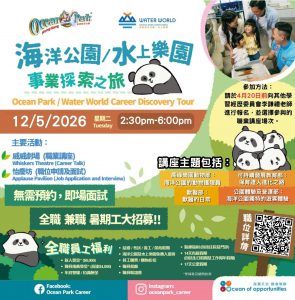 香港海洋公園誠意邀請高中學生—中四、中五及中六應屆畢業生參加「海洋公園及水上樂園事業探索之旅」。是次活動旨在讓求職者深入了解海洋公園及水上樂園的日常運營,由不同專業團隊介紹工作職能,為求職者帶來不一樣而且饒富意義的職業選擇。 除了求職者,我們亦期待所有到場的中學生能探索海洋公園的職涯發展機會。各位同學更可以參加各個職涯講座.亦可在活動期間獲取本園多個職業路向的第一手資訊,並且瞭解本園在推動教育及保育方面的工作。 「海洋公園及水上樂園事業探索之旅」詳情如下: 日期:2026年5月12日(星期二) 時間:下午2時30分至下午6時 活動地點: 海洋公園海濱樂園(纜車及海洋列車除外)