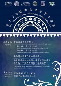 【第十五屆觀塘區傑出學生選舉】 闊別一年,觀塘區傑出學生協會(KTOSA)很高興宣布第十五屆觀塘區傑出學生選舉現正接受報名!歡迎就讀觀塘區學校的註冊學生參與,一展所長。本年度初中及高中組別選舉只可經自薦參選,請有意參選學生於截止時間(即2020年 4 月 25 日 23:59)前遞交表格報名。考慮到疫情嚴重,觀塘區傑出學生協會(KTOSA)對遞交表格之方法作出了改動,請參選同學務必仔細閱讀報名表格內的指引。詳情請參閱下列之宣傳海報、網上申請表格(https://drive.google.com/file/d/1m58-LSLVT_1sokhOMKwfKfLaqhD_cyvb/view?usp=sharing )及本會網站 (ktosa.org)。 是屆選舉共設有兩個組別: 初中組:中一至中三