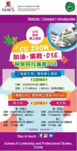 https://student-apps.scs.cuhk.edu.hk/pr/registration_39/ 中學文憑試考試在即,CUSCS全力為考生加油打氣,舉辦「CU Zoom:備戰・加油・DSE」實時網上講座系列,由學院講師分享中英文閱讀、寫作、聆聽與綜合能力試卷的應考心得、重點分析近年考題趨勢及題型,並在直播中解答同學的提問,幫助考生掌握答題技巧及其他需要注意的事項。 名額有限,先到先得。學院將於活動舉行前透過電郵方式發送網上直播連結給予成功報名的人士。 請選擇以下實時網上講座(可多項選擇) 日期 時間 活動內容 4月22日 (星期三)