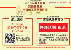 (I) 義工運動服務時數 網上 遞交 按教育局2020年3月21日停課宣布,2019年之義工服務記錄只接受網上遞交。有興趣參與之同學須於2020年4月19日11:59PM或以前,透過以下連結遞交2019服務時數及證明: https://forms.gle/c6hxs5hvMykRQ8o4A 申請者必須於網上表單提供正確無誤之個人資料(包括中英文姓名、班別、學號、義工紀錄冊編號及2019-1-1至2019-12-31期間服務總時數),及上載影像清晰之證明文件。任何不實或模糊的資料將不獲處理。 未能於以上限期遞交之2019年服務紀錄,將不獲處理。 (II)