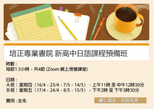 培正專業書院 新高中日語課程預備班 書院將會為有興趣報讀下學年新高中日語課程的同學,以網上視像課堂的形式,安排課前預備班 , 讓同學可以先預習外語課程的上課內容及上課模式,費用全免,有興趣的同學請填妥以下表格。 www.pca.edu.hk/nss-2021 內容 : 時數 :