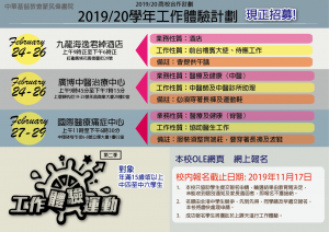 為鼓勵學生辨識自己的興趣及能力,認識工作世界,本校特參與由教育局統籌,不同機構提供的工作體驗計劃。學生在機構職員的帶領下,親身體驗不同行業工作實況,了解真實的職場環境、工作所需的能力、態度和要求,從而裝備自己,為將來升學及就業訂下目標。計劃費用全免。 工作體驗時段: 2020年2月期間 工作體驗時間: 全日 (上課天) 工作體驗對象: 中四至中五學生