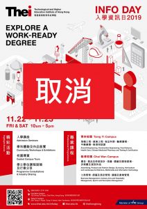 香港高等教育科技學院(THEi)資訊日2019活動取消 因應社會及交通不穩等情況,原訂於2019年11月22至23日舉行的THEi資訊日2019將會取消。原訂於資訊日提供的部份資訊,THEi會改為稍後於此網頁發布。 適合中六同學報讀之THEi學位課程,當中「指定專業/界別課程資助計劃」(SSSDP)課程可經聯招報名,而自資學士學位課程則會於2019 年11 月22 日開始接受報名,詳情請瀏覽此>>網址<<。 >>SSSDP課程資訊<< >>自資課程資訊<< THEi