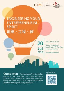 工程師的專長不只是數學計算!更多時候,我們運用創新的方法解決問題。香港工程師學會師傳薈* 即將舉辦一個講座,由不同背景的工程師分享他們創業道路上的經驗。歡迎蒞臨互相分享學習,釋放自己的潛能! 日期:2019年7月20日 (星期六) 時間:下午2:00 – 下午4:30 地點:九龍塘創新中心 展覽廳3 語言:英語