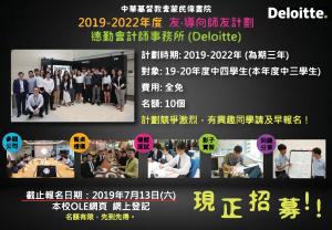 計劃簡介 「友‧導向」是由扶貧委員會籌劃的跨界別職志師友計劃。計劃旨在社區推動師友文化,促進青年人向上流動的能力,從而減低跨代貧窮。企業及市民成為友師,給予青年一代(特別是高中生)啟發和指導,幫助他們拓闊視野,積極投入教育、培訓或就業,規劃未來,並為達致自己訂立的教育、培訓及事業發展的目標作好準備。本校與德勤會計師事務所(Deloitte)合作,為中三學生提供一系列的職場體驗活動,讓學生在高中求學期間能夠獲得Deloitte友師的啟發,及早認識社會和職場的點滴,規劃人生! 此計劃向來反應熱烈,而名額有限,有興趣同學請盡快報名! 計劃時期: 2019-2022年 (為期三年) 對象: 19-20年度中四學生(本年度中三學生) 費用: 全免