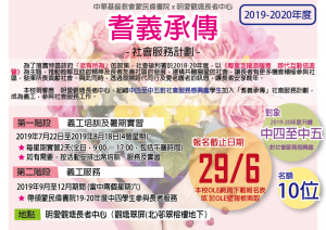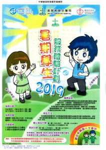 基督教聯合醫院與靈實醫院每年暑假期間均合辦「暑期學生服務體驗計劃」,安排完成中四或以上學生到基督教聯合醫院參與為期六星期的義務工作,讓學生藉此機會了解醫療服務的運作,加深對醫護行業的認識,從而擴闊視野及更了解自己的興趣與能力。 整項計劃除安排參加者到基督教聯合醫院或靈實醫院不同部門或病室工作外,亦會透過講座、研討、參觀等項目,讓參與者對待人處事及生老病死等課題有更深的體會,達至個人的成長,對有意投身醫療行業的學生是一個難得的學習機會。 服務時期: 3/6/2019 – 28/6/2019(第一期) 22/7/2019 – 16/8/2019(第二期)
